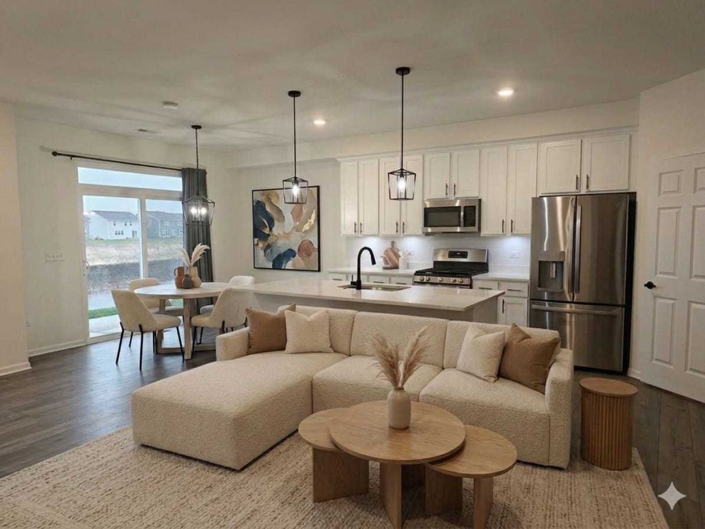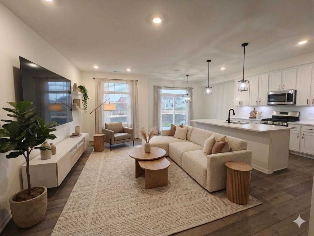 MOVE-IN READY! Barely 2-year-old 3-bedroom, 2.5-bath townhome featuring the popular Braeden model. The main level offers 9-foot ceilings and a bright open-concept layout connecting the family room and kitchen, complete with quartz countertops, a walk-in pantry, and GE stainless steel appliances. Neutral paint and flooring throughout make this home feel fresh and welcoming. Situated on a premium exterior lot with small water views and no homes directly behind, this home offers added privacy and a peaceful setting. The second-floor laundry includes a washer and dryer for everyday convenience. Additional highlights include window treatments throughout, matching lighting fixtures, ceiling lights in the secondary bedrooms, and a ceiling fan/light combo in the primary bedroom. Extremely well priced for a quick sale-don't wait to make this one yours!