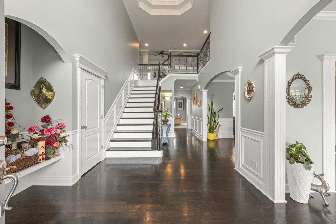 Welcome to this beautifully updated custom brick front home in the highly sought-after Dunmoor Estates, where exceptional quality meets modern peace of mind. From the moment you step into the fully renovated foyer, you will appreciate the sun-filled rooms, elegant tray ceilings, and meticulous millwork that flow throughout the entire residence. The heart of the home is a gourmet kitchen completely renovated in 2023, featuring crisp white cabinetry, elegant quartz countertops, and a beautiful custom backsplash. The kitchen is designed with a large island with a breakfast bar and a spacious eating area perfect for daily living. The main level is built for maximum versatility, offering a first-floor bedroom paired with a full bathroom-perfect for guests or multi-generational living-as well as a flexible office or playroom that provides the option for two private home offices. Upstairs, a comfortable loft-style den leads to three additional bedrooms, each enhanced with custom lighting and tray ceilings. The expansive primary suite is a true showstopper, boasting a massive 12x30 walk-in closet and a spa-like bath with a jacuzzi tub and dual vanity. For car lovers and enthusiasts, the finished basement provides a large recreational area, a dedicated gym space, an additional bedroom, and a full bath, all connected to the custom-built 3-car garage via a private internal staircase. The exterior is equally impressive, featuring fresh landscaping, a stamped brick driveway, and a spacious matching patio perfect for outdoor gatherings. Recent Updates & Home Ages: Kitchen Renovation (White Cabinets, Quartz, Backsplash): 2023 Fully Renovated Foyer: 2023 Water Heater: 2023 Garage Doors: 2023