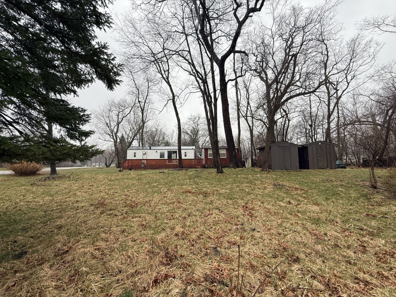 Two fully sewered lots in an excellent location! This 1984 Park Model with skirting features two bedrooms and one and a half baths, offering ample sleeping space. Like new metal roof put on Park Model in late 2024, early 2025. Situated on a sewered lot with winter water access, it's perfect for year-round enjoyment. The property includes a spacious deck and a four-season room for added entertaining space. Conveniently located just a short distance from Beach & Pool II and close to great amenities, you'll appreciate being in the center of it all. Additional highlights include three storage sheds, a picnic table, a fire pit, and common ground at the rear. Call today for a showing! Please note that Woodhaven Lakes is a gated recreational community and cannot be used as a primary residence or homestead. You must be accompanied by a broker to view any properties, YOU CANNOT ACCESS THE CAMPGROUND WITHOUT A PASS. The property owner pays the association fees.