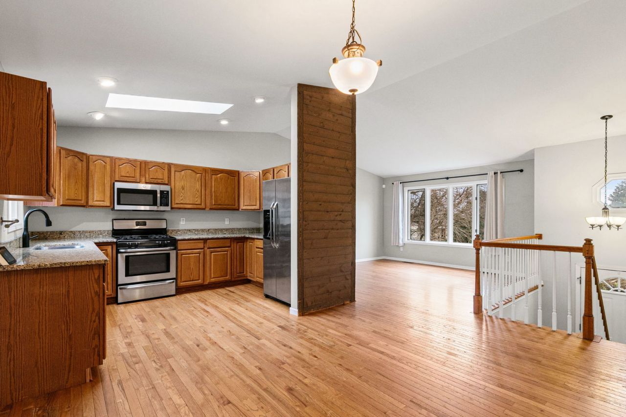 Step inside and be greeted by airy vaulted ceilings and an abundance of natural light filling the main living space. The main level offers newer hardwood flooring and an inviting layout perfect for everyday living and entertaining. The spacious eat-in kitchen boasts granite countertops, stainless steel appliances, ideal for both casual meals and hosting gatherings. All three bedrooms feature new wood laminate flooring, complemented by stylish shiplap accents that bring a modern, designer touch. Outside, enjoy FULLY FENCED YARD with a newer wood fence and a huge deck-perfect for relaxing or entertaining. Additional updates include a newer tear-off architectural shingle roof and a newer garage door on the oversized 2-car garage. The crawl space off the garage offers excellent extra storage. Located in a quiet setting with an open wooded area to the right, this home offers added privacy and a peaceful backdrop. NEW HVAC and UPDATE ELECTRIC PANEL. Move right in and start enjoying-this one truly feels like home!