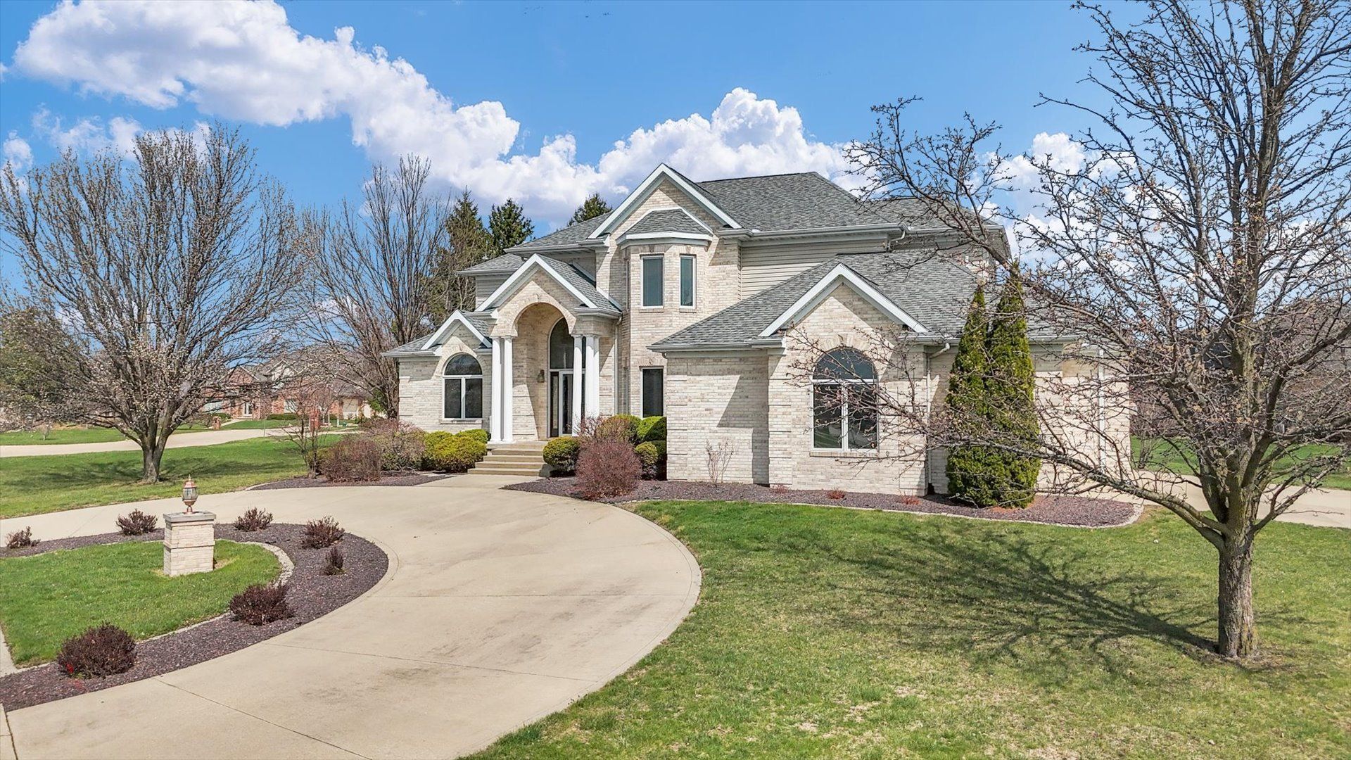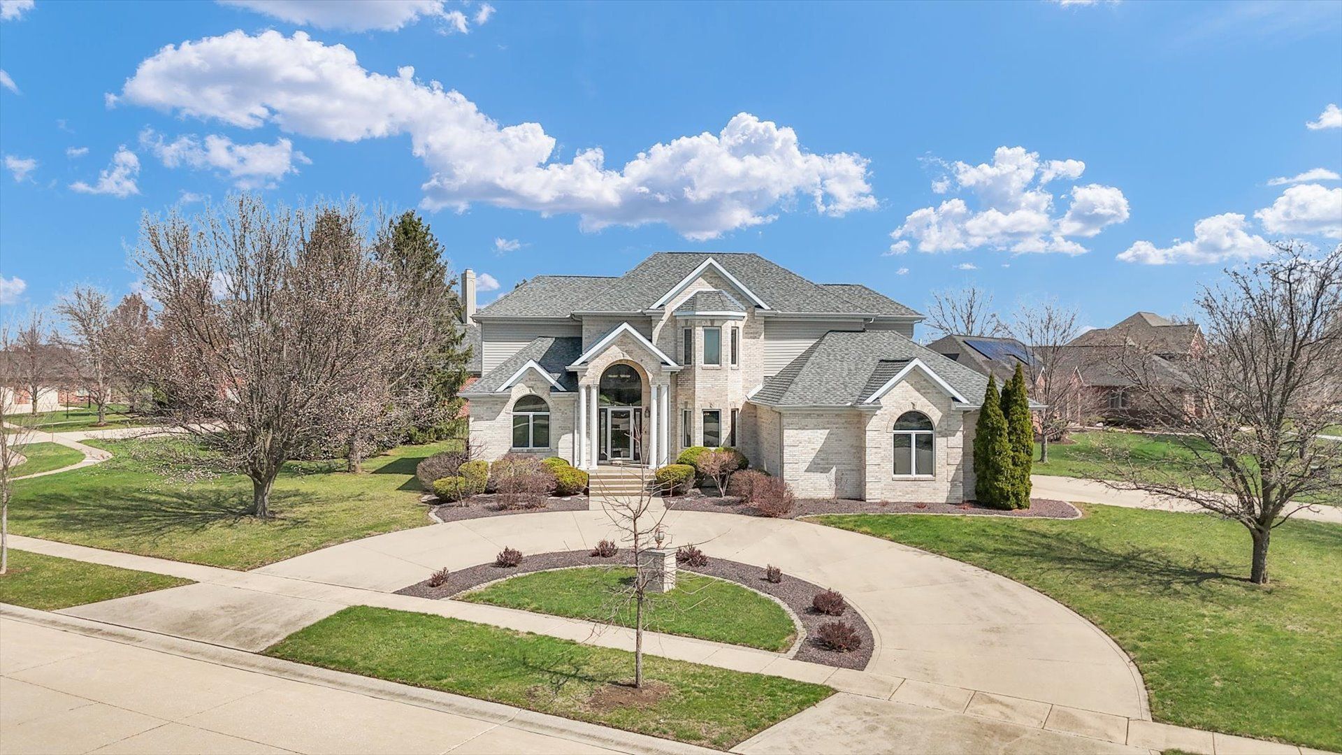 Stately Home in Trails at Brittany. Situated on a 1/2 acre lot at the entrance of a quiet cul-de-sac, this beautiful home offers great curb appeal with an all-brick front and circular drive for guests. Inside, a bright two story entry welcomes you into a spacious and flowing floor plan. The main level features a gourmet kitchen with breakfast area and access to the paver patio, a large family room, separate living and dining rooms, and flexible space for home offices or a sixth bedroom. Upstairs, the impressive primary suite includes a spa-like bath with dual vanities, jetted tub, walk-in closet, and custom shower. The finished basement is ideal for entertaining guests, complete with a wet bar, full kitchen, bedroom, full bath, and generous living space. Outdoor living includes a private patio with views of the neighborhood lake. Recent updates include Roof (2018), HVAC (2025), and upstairs water heater (2025), along with Pella windows with built-in blinds, surround sound, irrigation system, and custom cabinetry throughout.