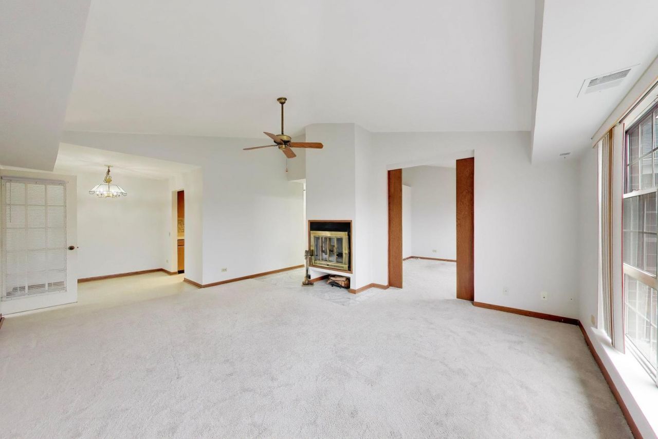 Top-floor penthouse living with vaulted ceilings and a cozy fireplace in the sun-filled living room. Enjoy your morning coffee or unwind on the private balcony with peaceful views. Freshly painted throughout and move-in ready. Spacious primary suite features multiple closets and a private bath. Versatile second bedroom is perfect for guests, a home office, or flex space. Conveniences include in-unit washer and dryer, heated underground parking, and storage. Ample outdoor parking is available for guests. Well-maintained building with a community pool for summer enjoyment. Great location near hospital, shopping, library, Pavilion Fitness Center, Busse Woods, restaurants, and easy access to expressways. No rentals. No dogs.