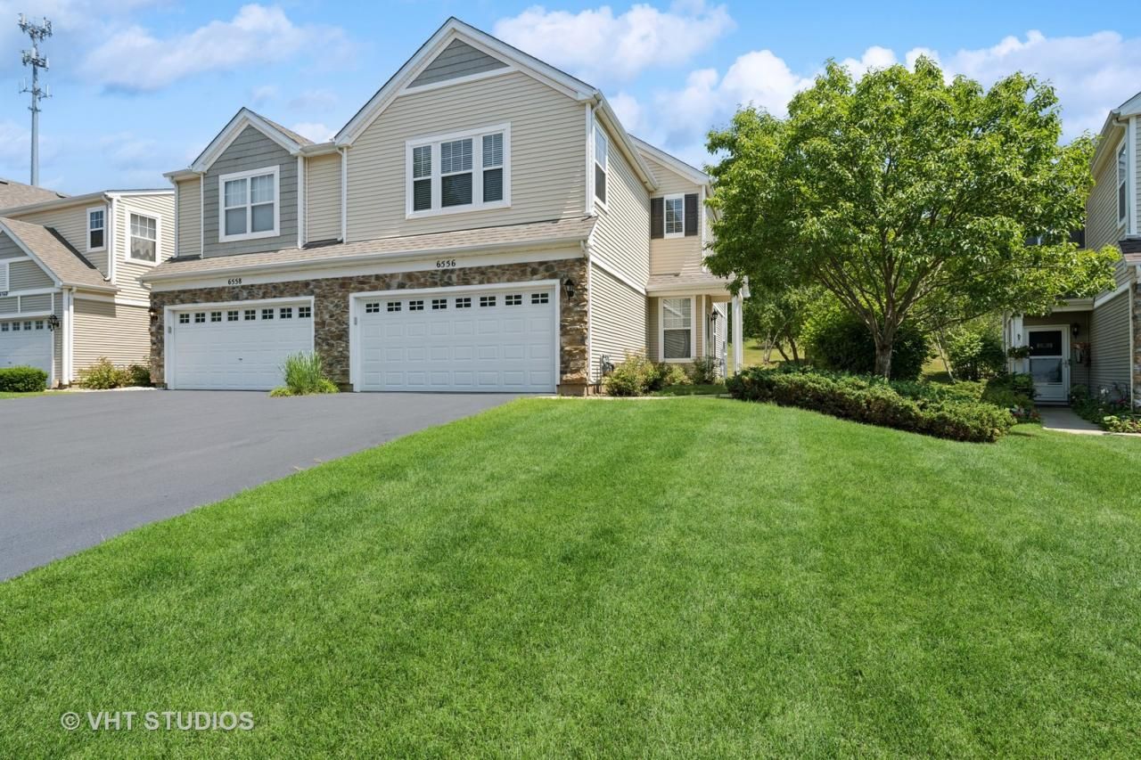 FOR SALE in Silverstone Lakes | Welcome home to 6556 Marble Lane-a beautifully updated 2-bedroom, 2.5-bath end-unit townhome with a spacious 2-car garage, tucked into the desirable Silverstone Lakes community. This Amber model offers nearly 1,550 sq ft of thoughtfully designed living space with soaring 9-foot ceilings and a bright, open-concept layout that's perfect for both entertaining and everyday comfort. The main level showcases rich laminate hardwood flooring, an upgraded kitchen with striking black granite countertops, modern fixtures, and a refreshed powder room. Upstairs, you'll find a light-filled second bedroom with a generous 14x4 walk-in closet, a full hall bath, and a convenient second-floor laundry room. The 23x13 primary suite is a true retreat-featuring refinished hardwood flooring, an impressive 11x7 walk-in closet, and a spa-inspired ensuite bath complete with a double-sink vanity, glass-enclosed shower, and oversized Kohler whirlpool tub-ideal for winding down after a long day. Enjoy end-unit privacy and step outside to a walk-out patio and private backyard, perfect for morning coffee or evening relaxation. Recent mechanical updates include a high-efficiency Rheem furnace (last serviced in 2024) and a 2022 Rheem hot water heater. Plus, you're just steps from scenic community ponds, gazebos, walking trails, and neighborhood parks. Experience a blend of comfort, style, and convenience in this beautifully maintained home in one of Carpentersville's most welcoming neighborhoods.