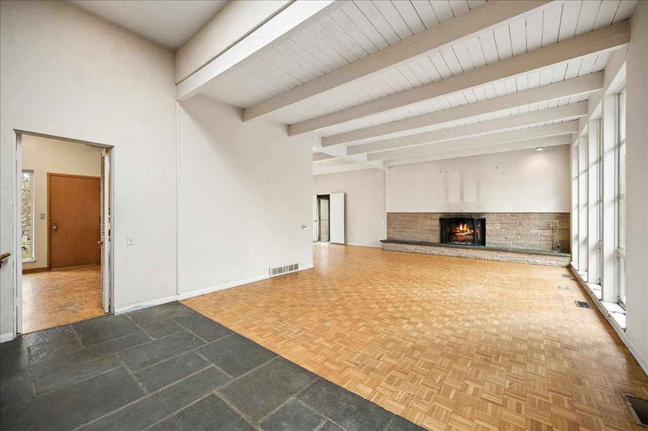 Sunlight abounds in this spacious, nearly 3300sq.ft. Glencoe mid-century modern split level with sub basement. The home, with attached 2 car garage, sits on .33 acres in a perfect cul-de-sac location, backing to a nature preserve paradise. Gorgeous beamed ceilings, parque wood floors, and oversized windows are just a few of the timeless original 50's characteristics in this well lived home. The kitchen boasts all stainless steel appliances and room for a table in addition to the separate adjacent dining room. The enclosed porch adds extra space for entertaining, a den, or play space. A wood-burning fireplace anchors the main living living room which is plenty big for the whole family. One level up the extra wide staircase you'll find four bedrooms including the primary en suite, one additional full bath & closets! closets! closets! The lower level gives access to the large 2 car garage. You'll also find on the lower level an extra bed/office, full bath & cozy family room leading to a large patio for entertaining equipped with a Weber gas grill. A recreation room, laundry & mechanicals are located in the sub basement. A circle driveway adds convenience to this prime location on the far end of a quiet cul-de-sac. This home is just steps from West school, a play ground, tennis & pickleball courts, the lagoons for hiking, biking, fishing and kayaking, & The Chicago Botanic Garden. This is a rare opportunity in Glencoe, Great space, Great Lot!!